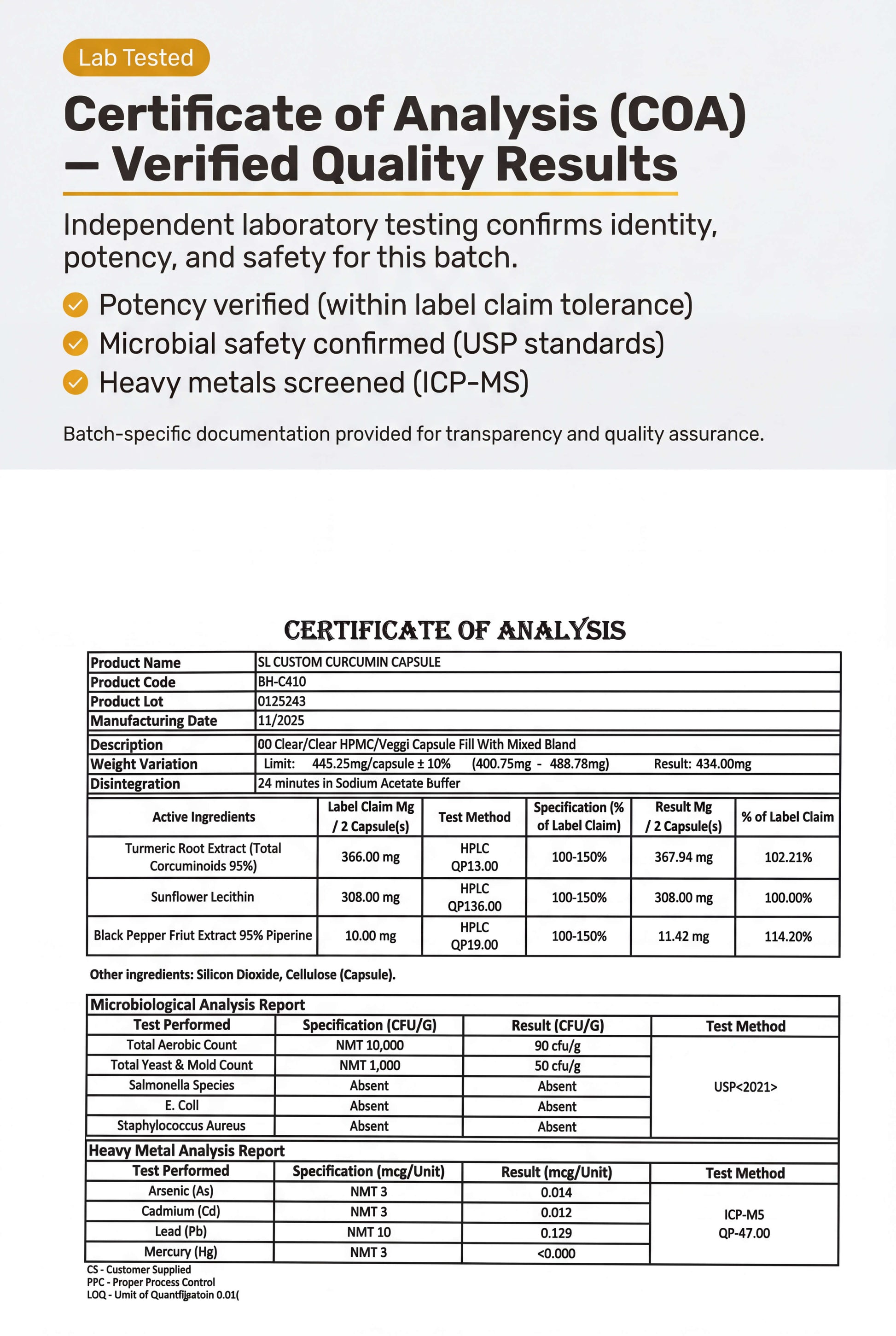 - Superior Absorption: Black pepper and Phytosome technology increase absorption significantly, optimizing curcumin's impact.