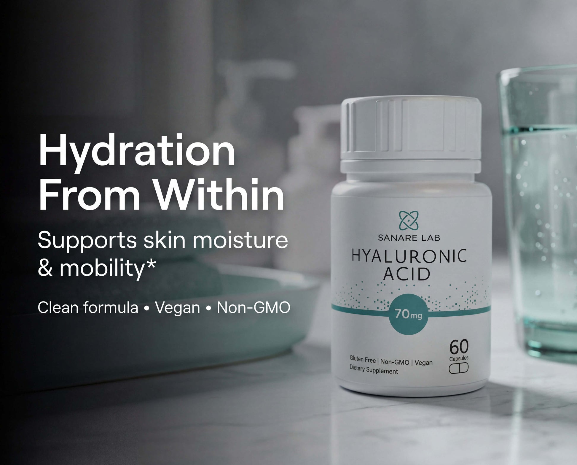 Support your joints, skin, and connective tissues with our Hyaluronic Acid 70 mg — a clean, science-inspired formula designed to promote natural hydration and everyday comfort. Hyaluronic Acid is naturally found in the body, where it plays a key structural role in joint lubrication, tissue cushioning, and maintaining smooth, hydrated skin.