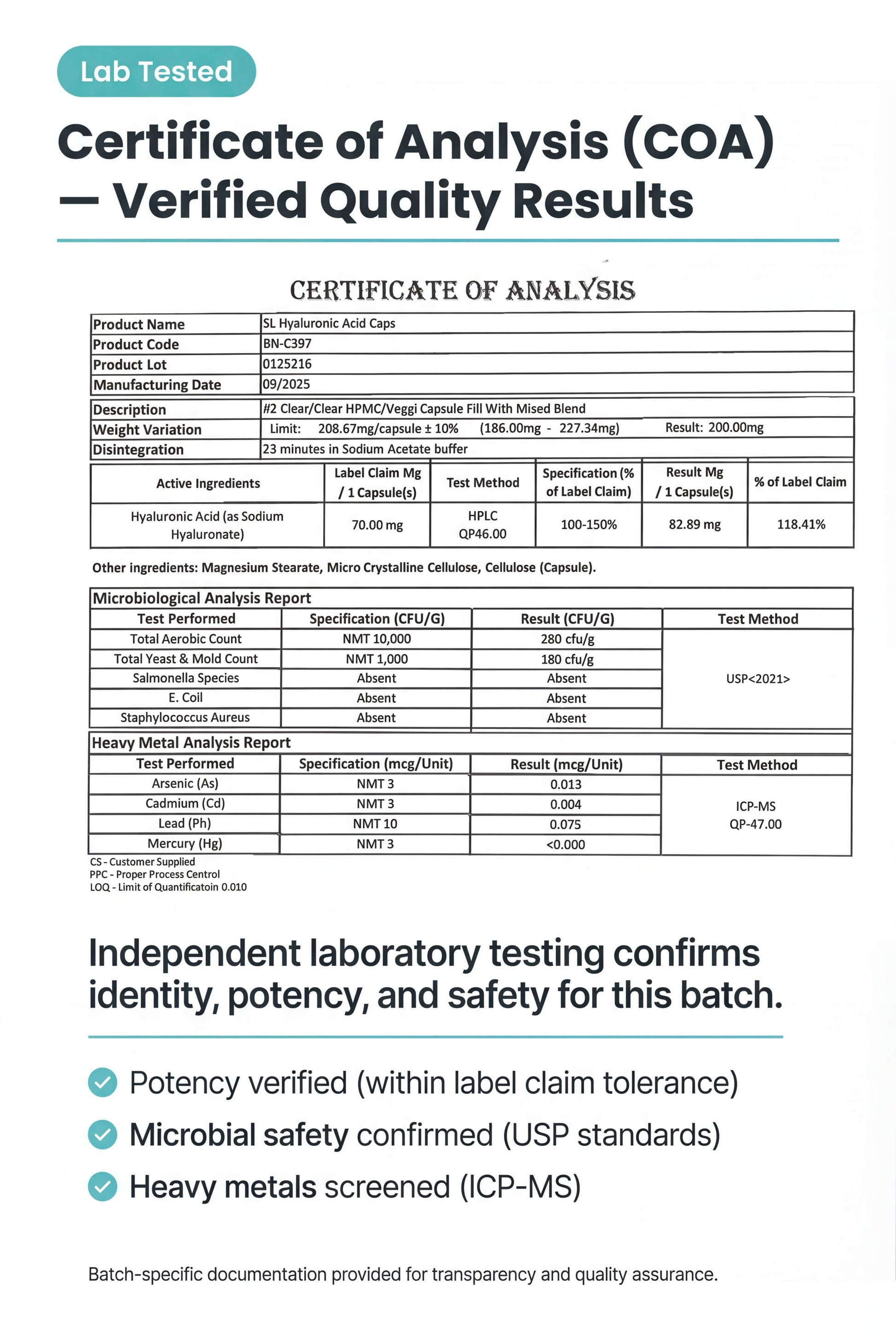 - 70 mg of high-quality Hyaluronic Acid (as Sodium Hyaluronate)